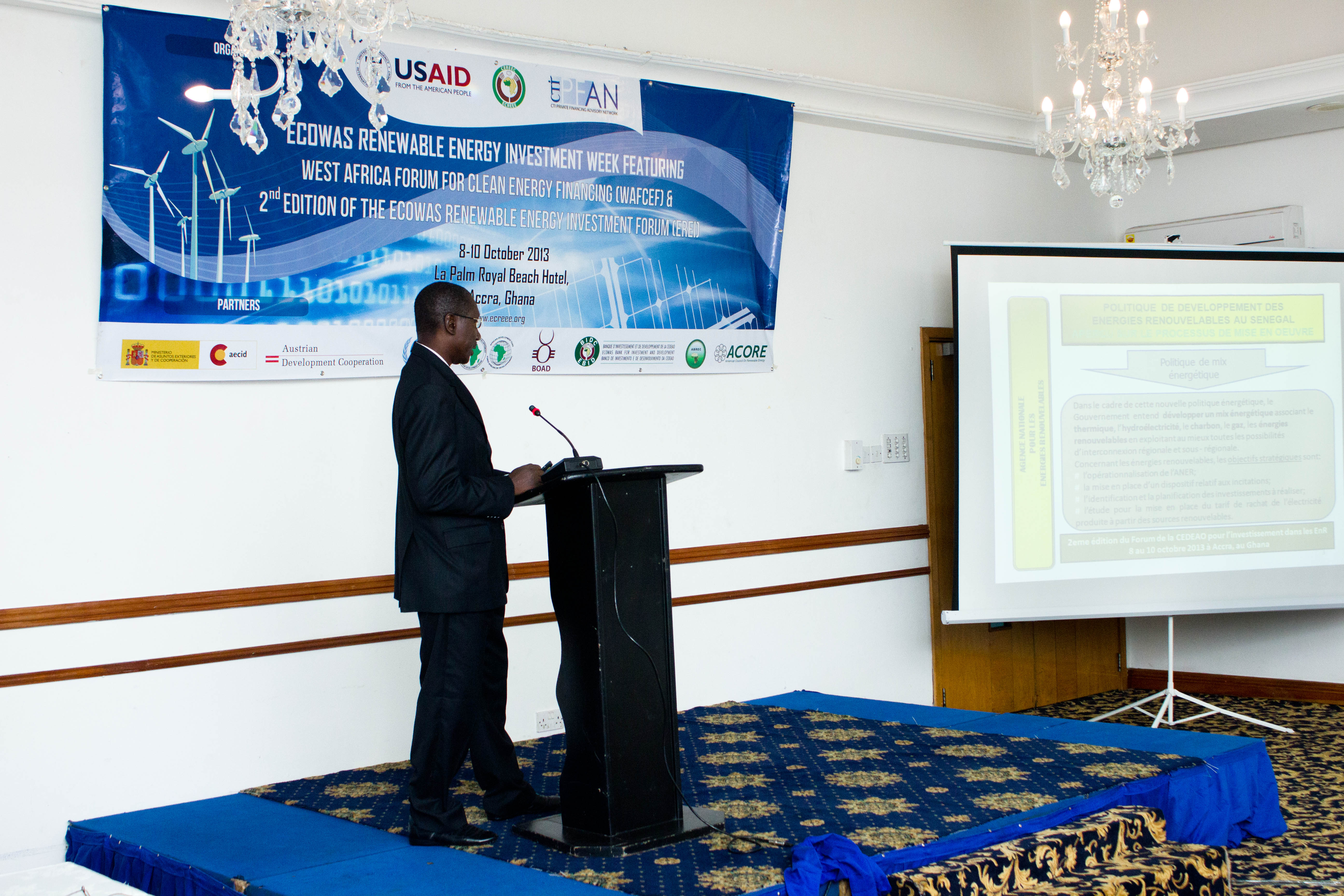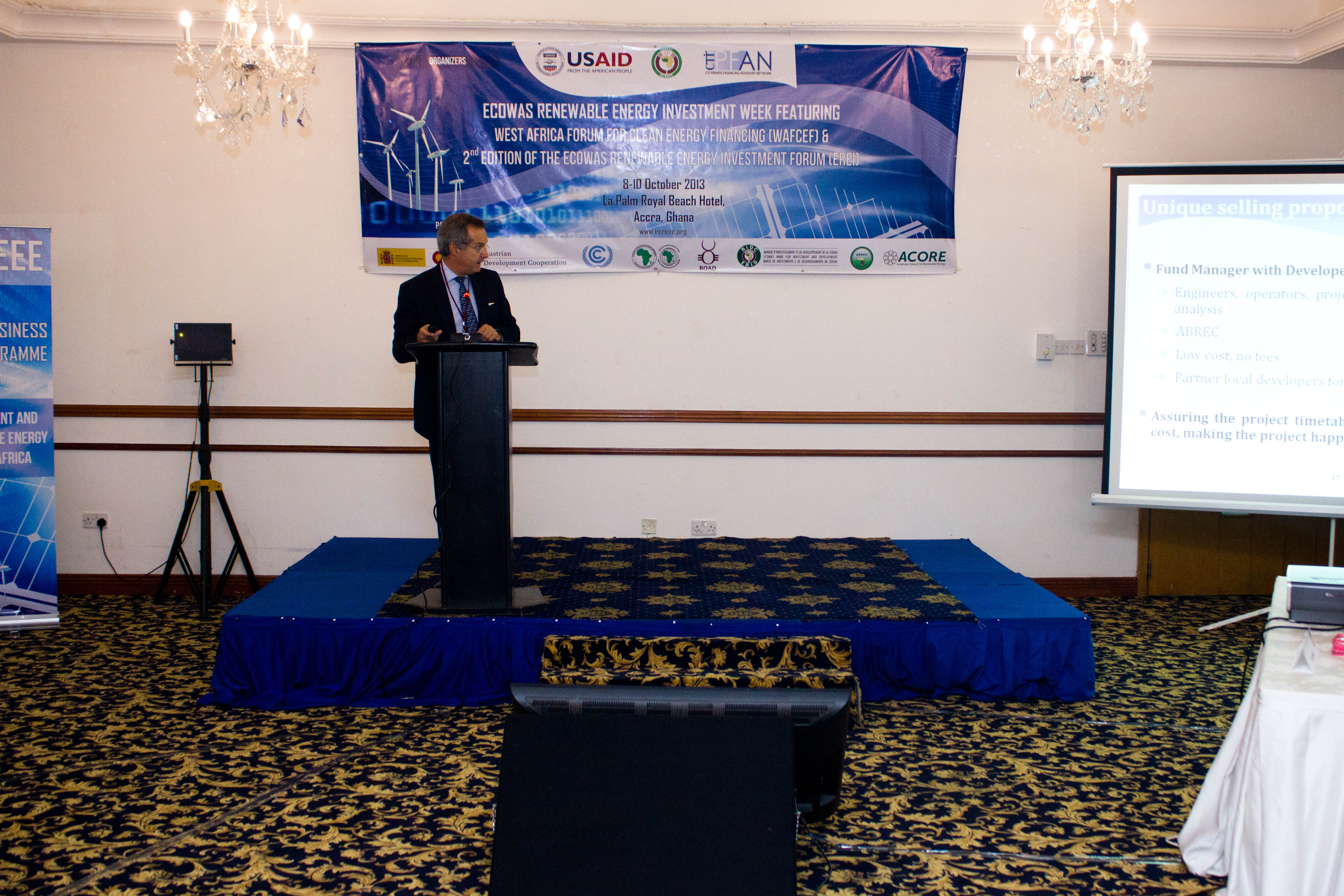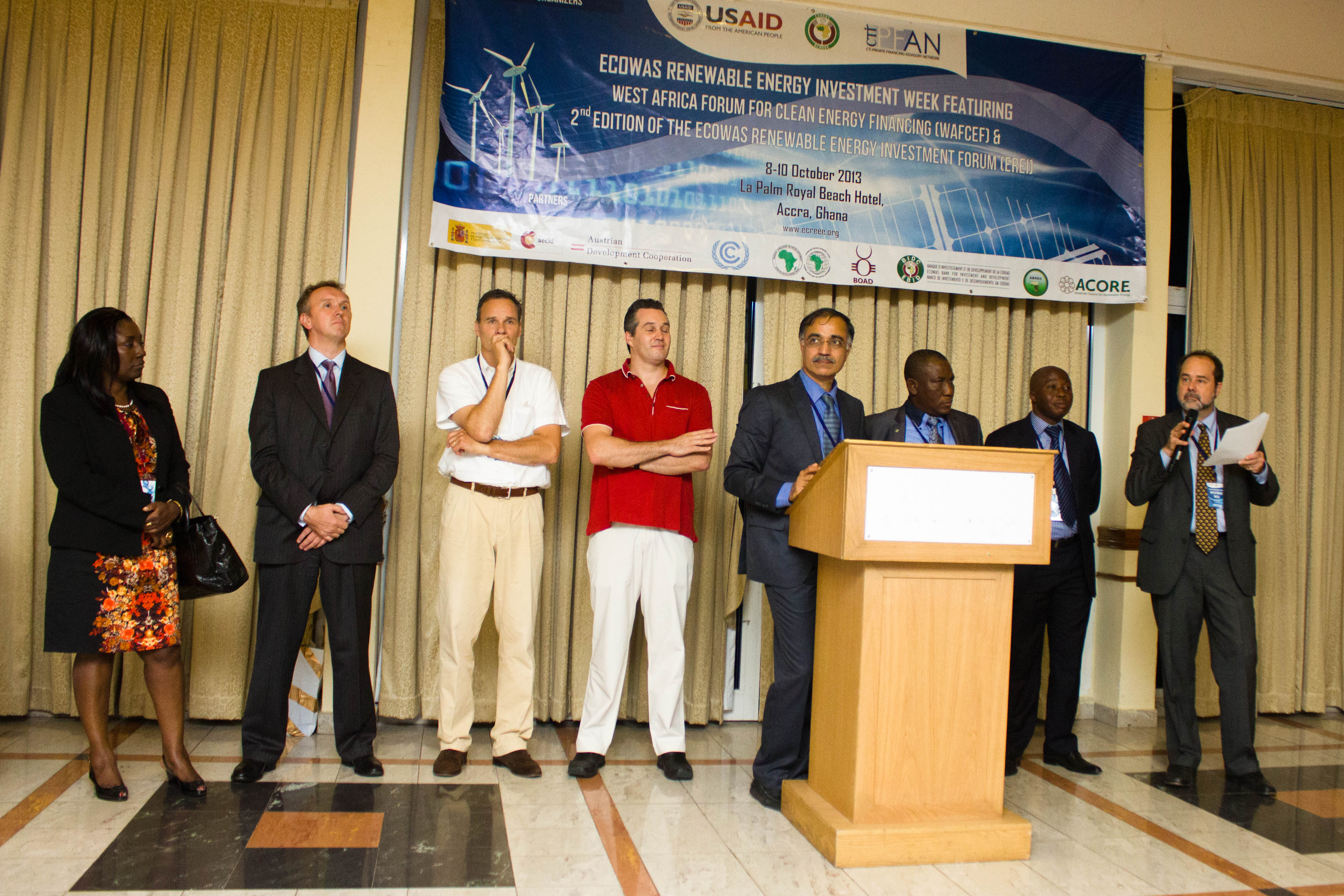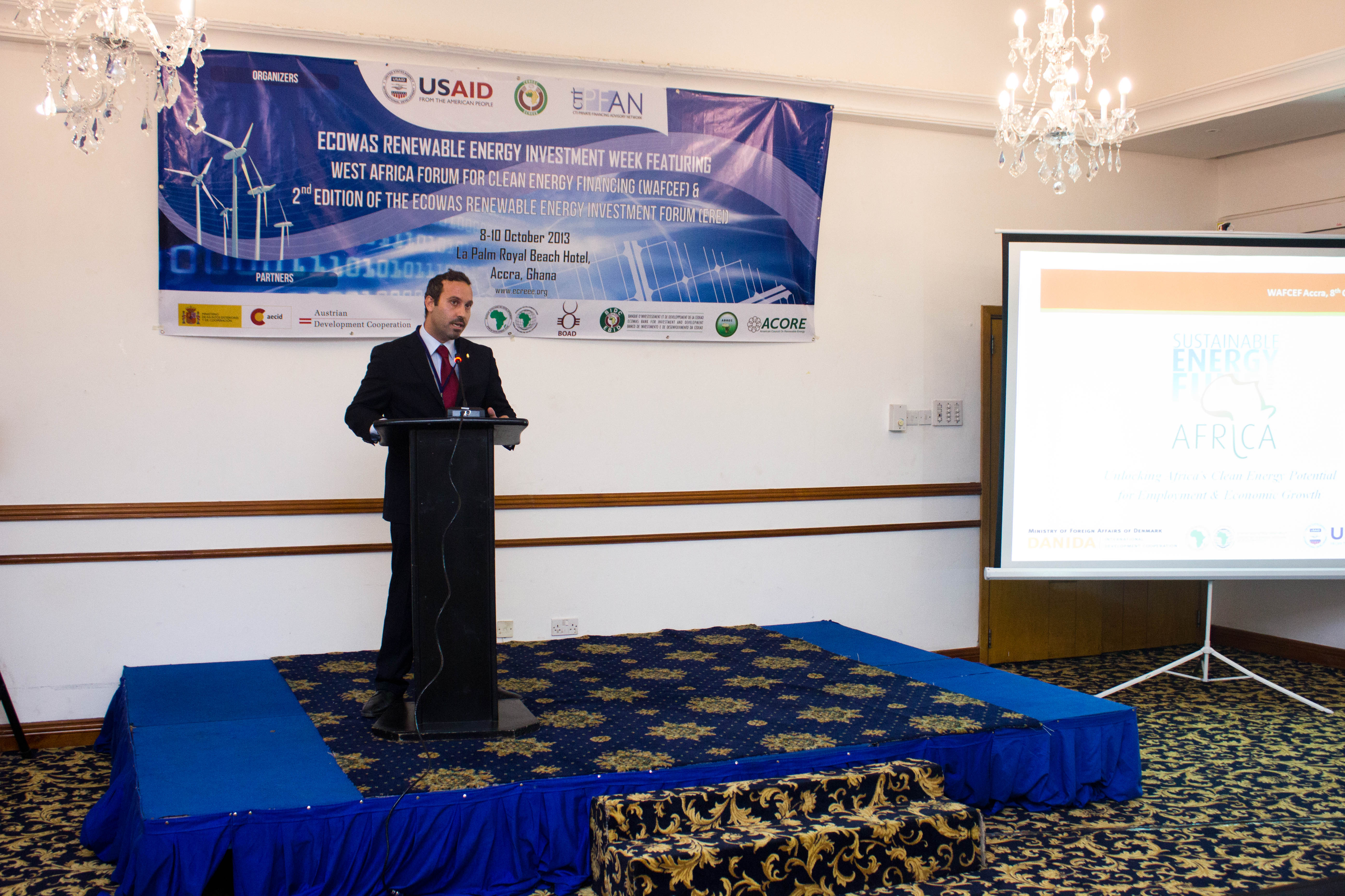 Accra, Ghana – October 8th -10th, 2013 - The ECOWAS Centre for Renewable Energy and Energy Efficiency (ECREEE), in collaboration with the USAID Regional Clean Energy Initiative, the Climate Technology Initiative-Private Financing Advisory Network (CTI-PFAN), the Regional Collaboration Centre of the United Nations Framework Convention on Climate Change (UNFCCC-RCC), the African Development Bank (AfDB), the ECOWAS Bank for Investment and Development (EBID), the West African Development Bank (BOAD), and the African Biofuel and Renewable Energy Company (ABREC) organized the ECOWAS Renewable Energy Investment Week, featuring the West African Clean Energy Finance Forum and the ECOWAS Renewable Investment Forum.