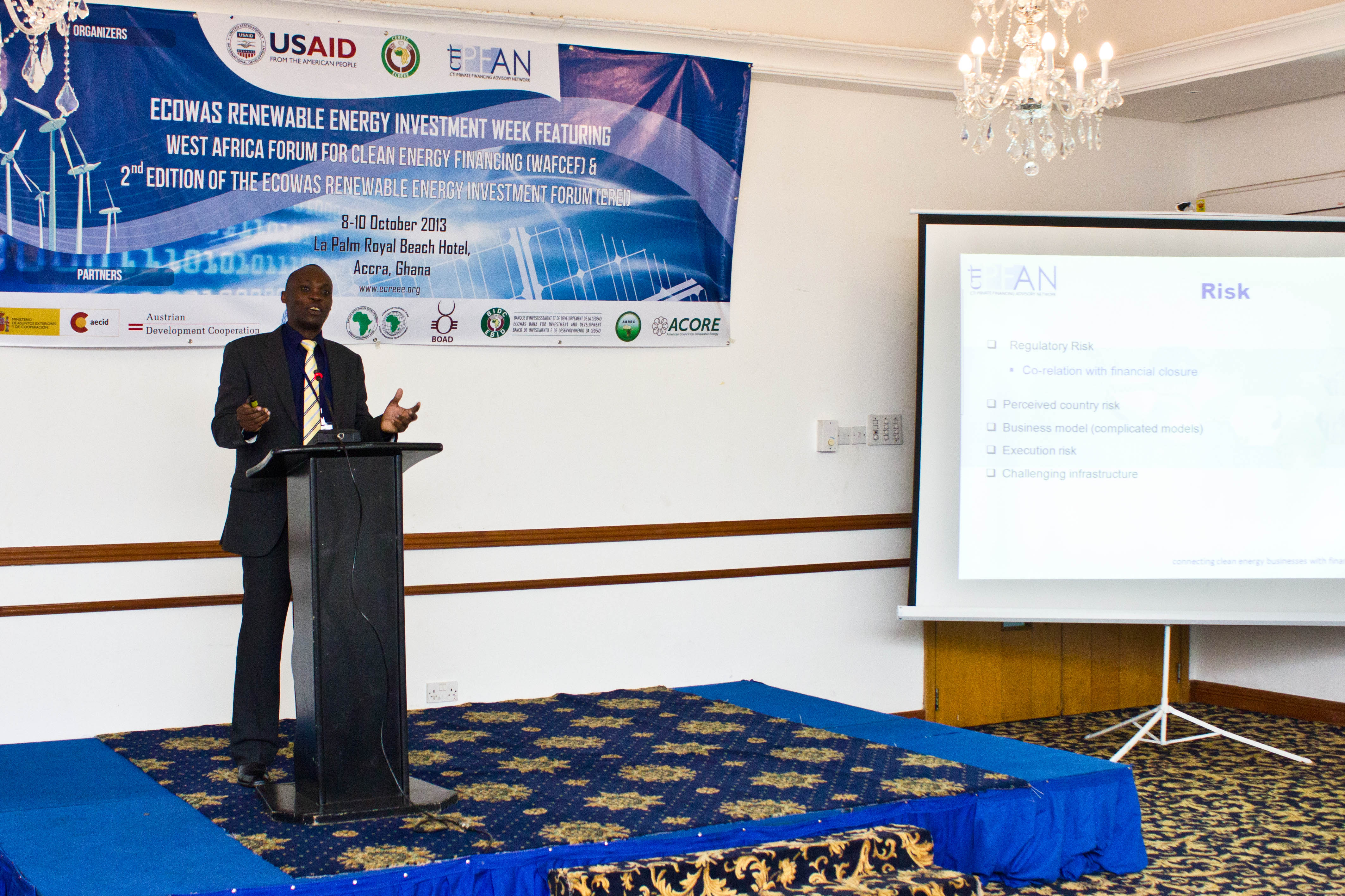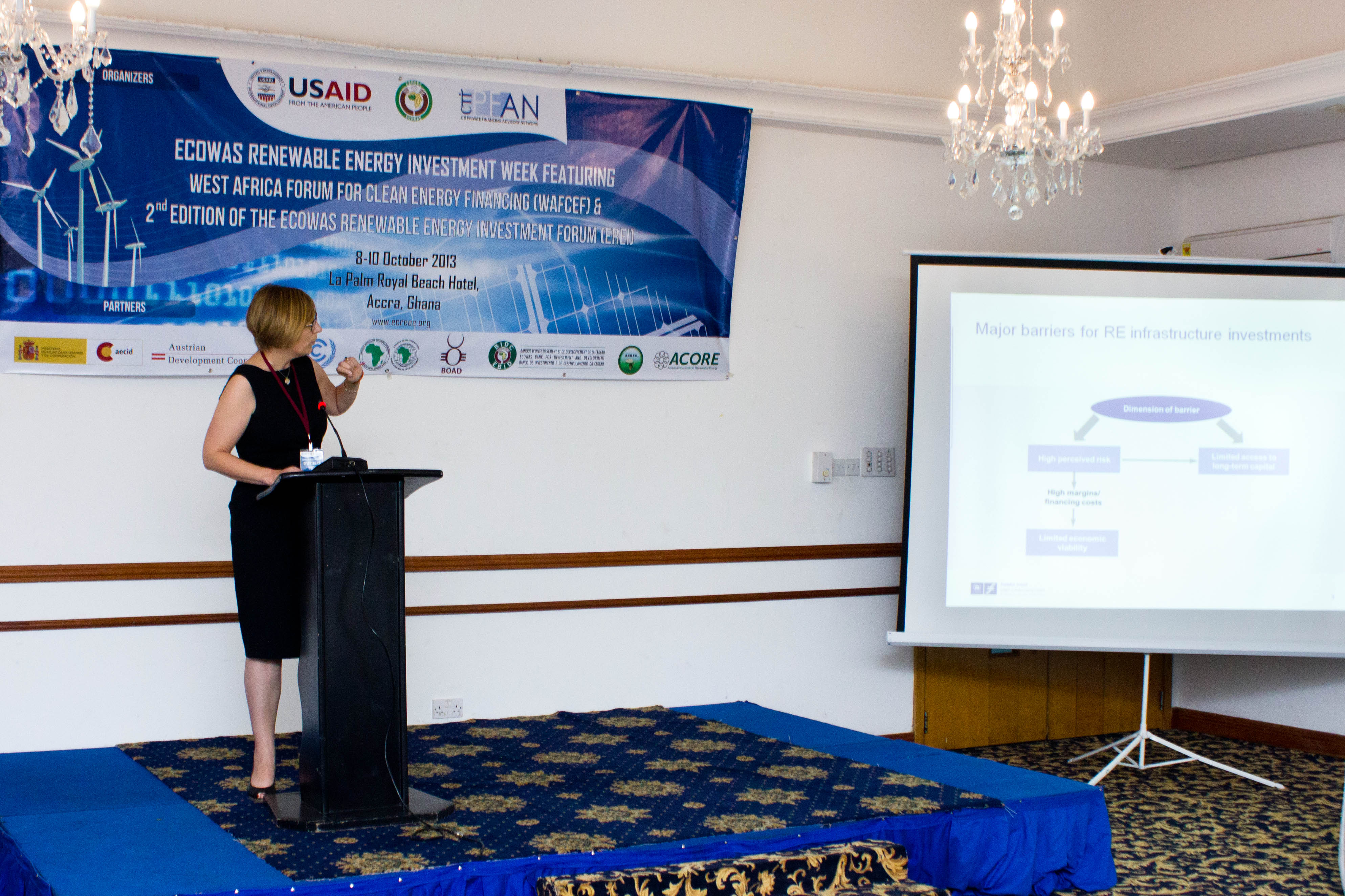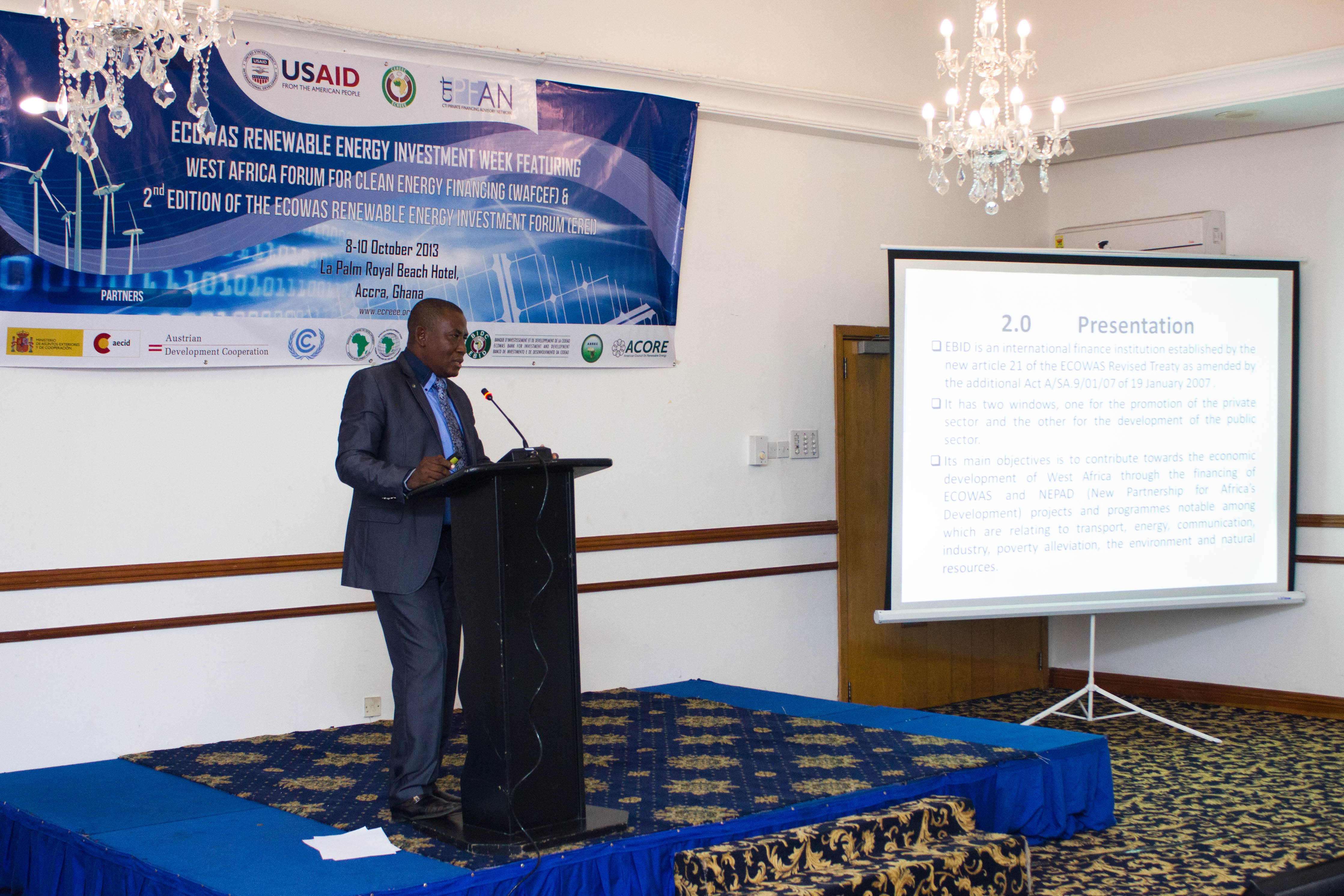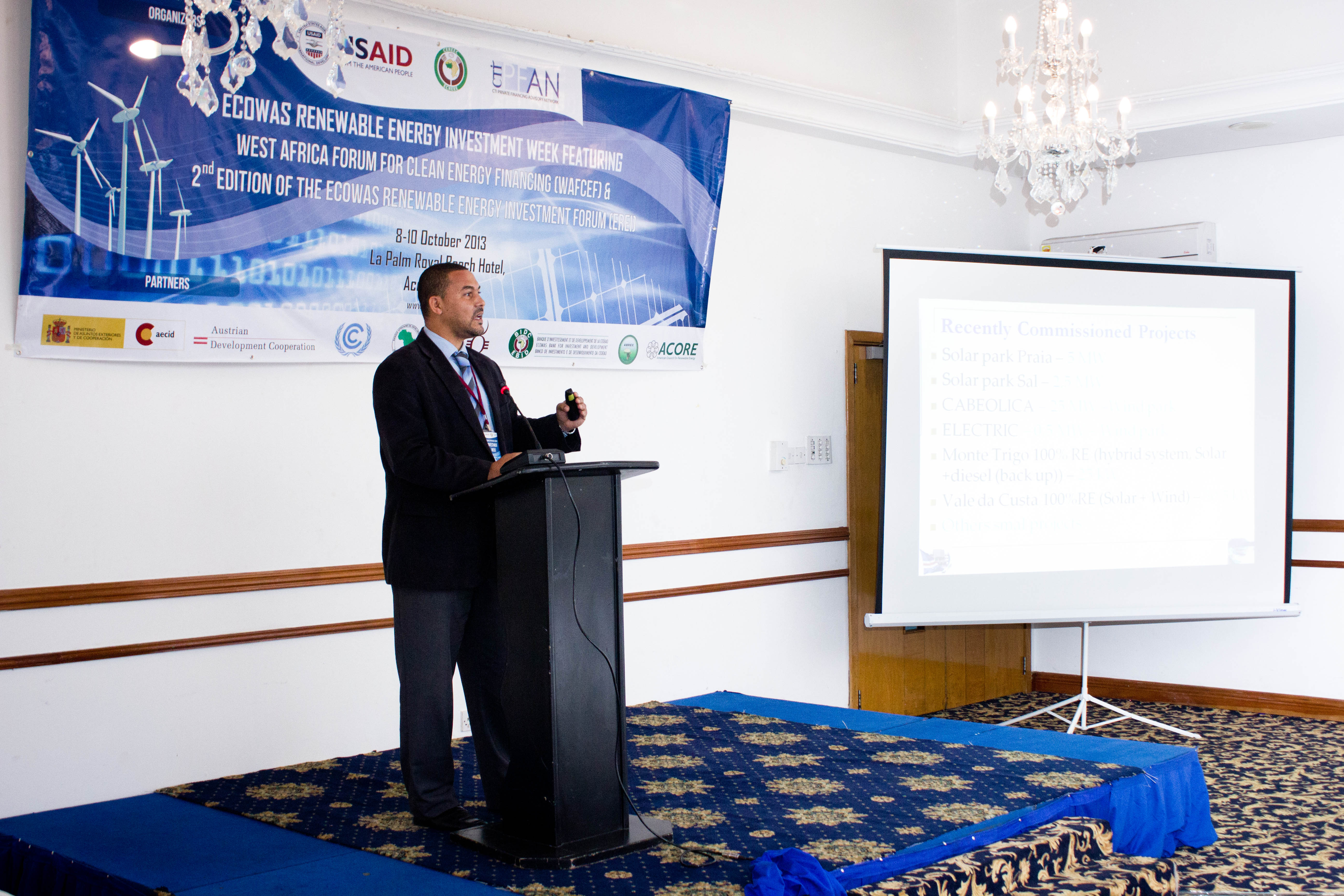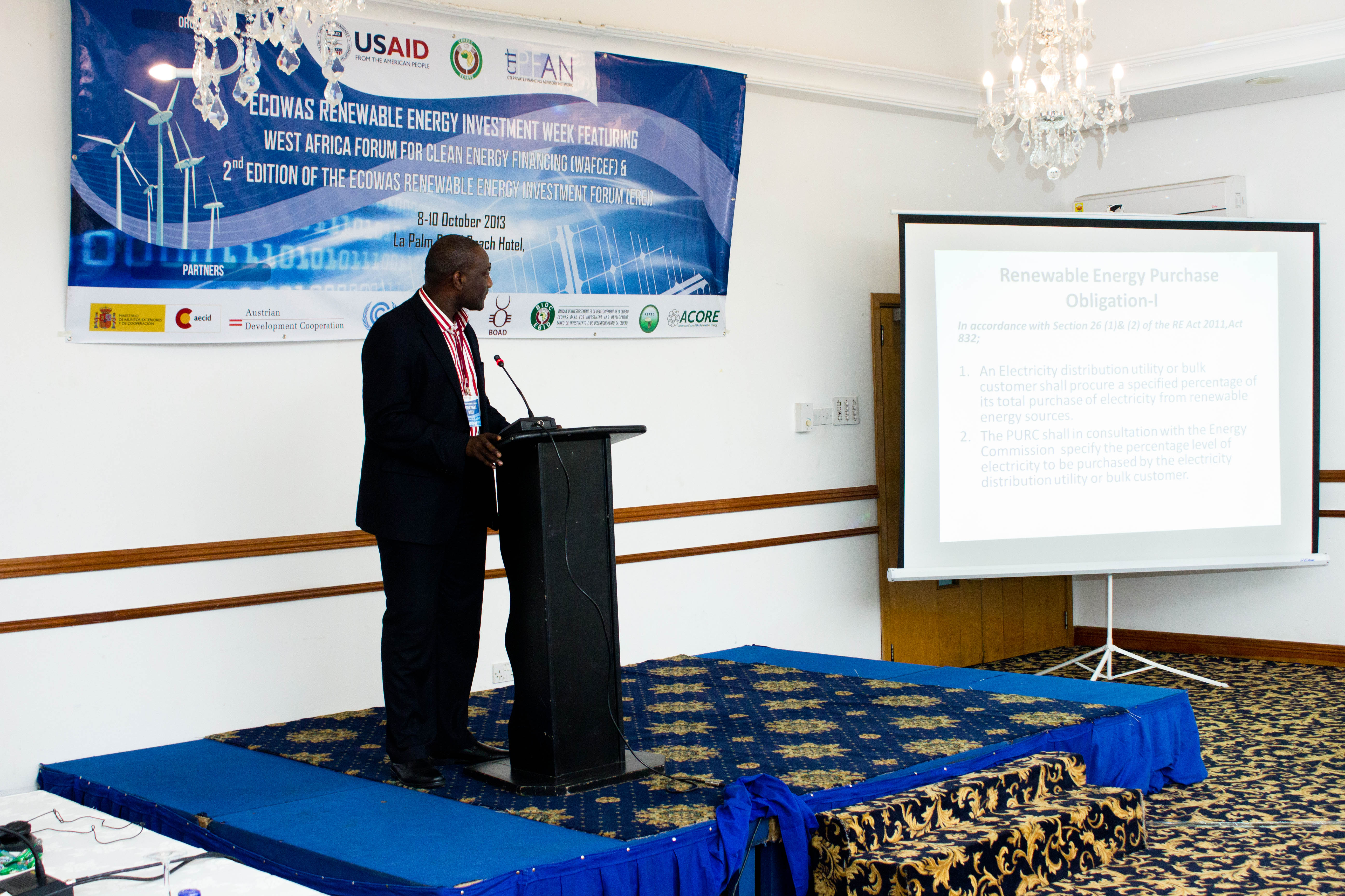 Accra, Ghana – October 8th -10th, 2013 - The ECOWAS Centre for Renewable Energy and Energy Efficiency (ECREEE), in collaboration with the USAID Regional Clean Energy Initiative, the Climate Technology Initiative-Private Financing Advisory Network (CTI-PFAN), the Regional Collaboration Centre of the United Nations Framework Convention on Climate Change (UNFCCC-RCC), the African Development Bank (AfDB), the ECOWAS Bank for Investment and Development (EBID), the West African Development Bank (BOAD), and the African Biofuel and Renewable Energy Company (ABREC) organized the ECOWAS Renewable Energy Investment Week, featuring the West African Clean Energy Finance Forum and the ECOWAS Renewable Investment Forum.